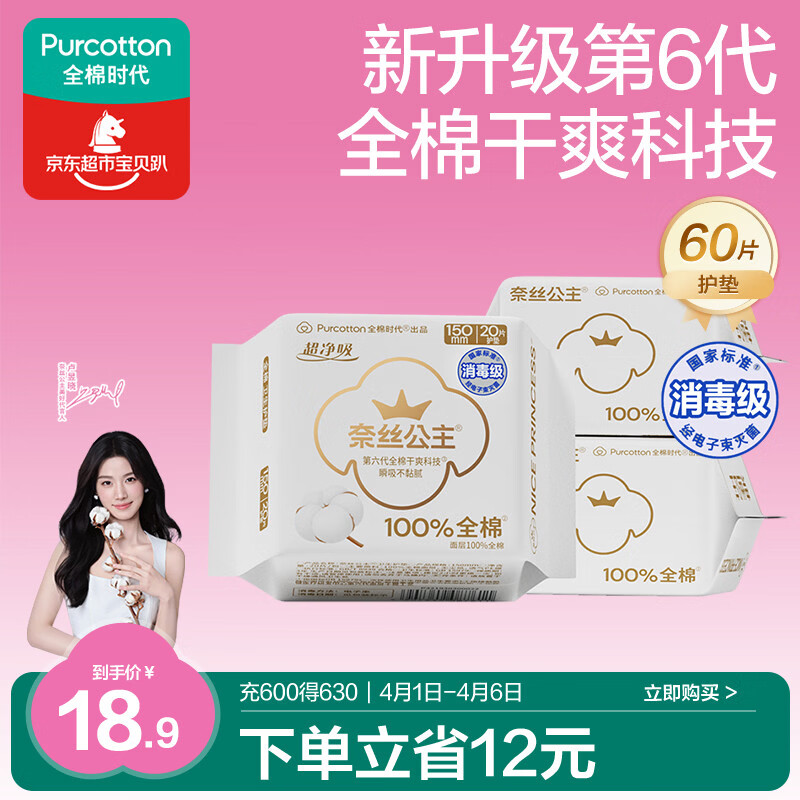 自营全棉时代【卢昱晓推荐】奈丝公主消毒级超净吸护垫超薄日用3包(150*60p)