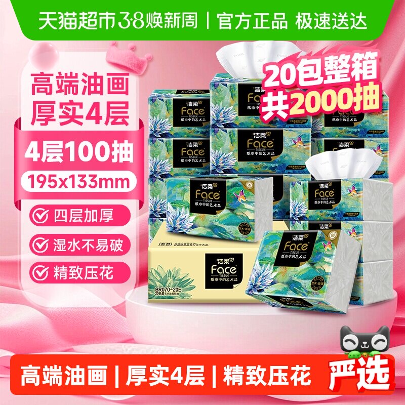 旗舰店洁柔抽纸繁花系列纸面巾无香抽纸巾可湿水干湿两用软抽擦手纸 3层 100抽*20包