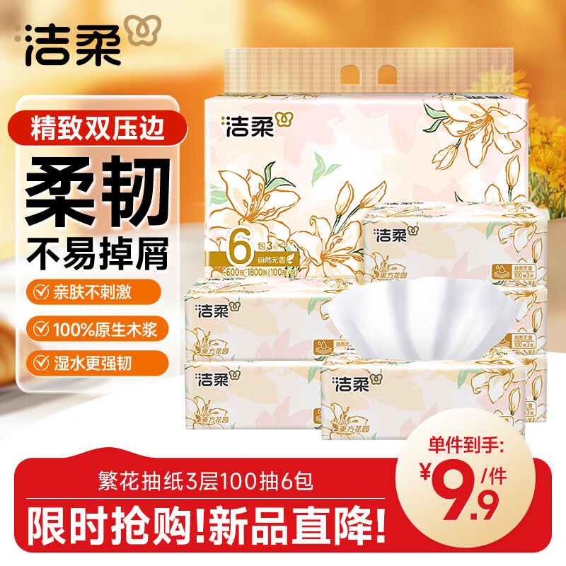 自营洁柔繁花抽纸 柔韧纸巾3层100抽*6包 面巾纸 湿水不易破