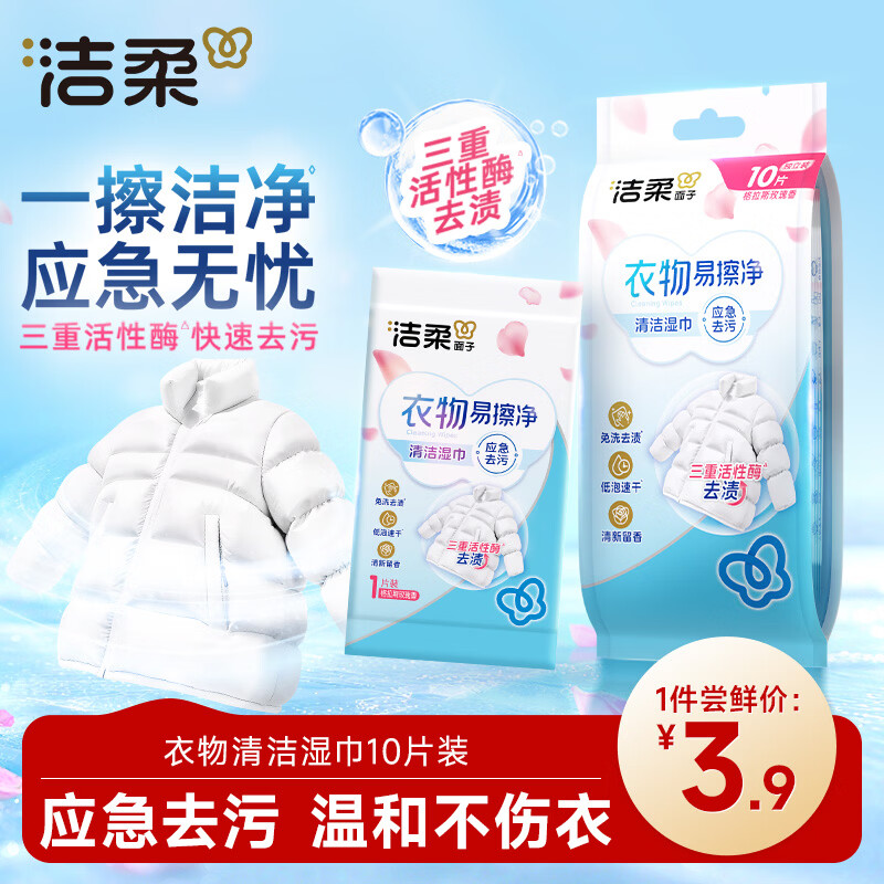 自营洁柔衣物清洁湿巾10片装免水洗羽绒服湿纸巾易擦净快速去污低泡速干