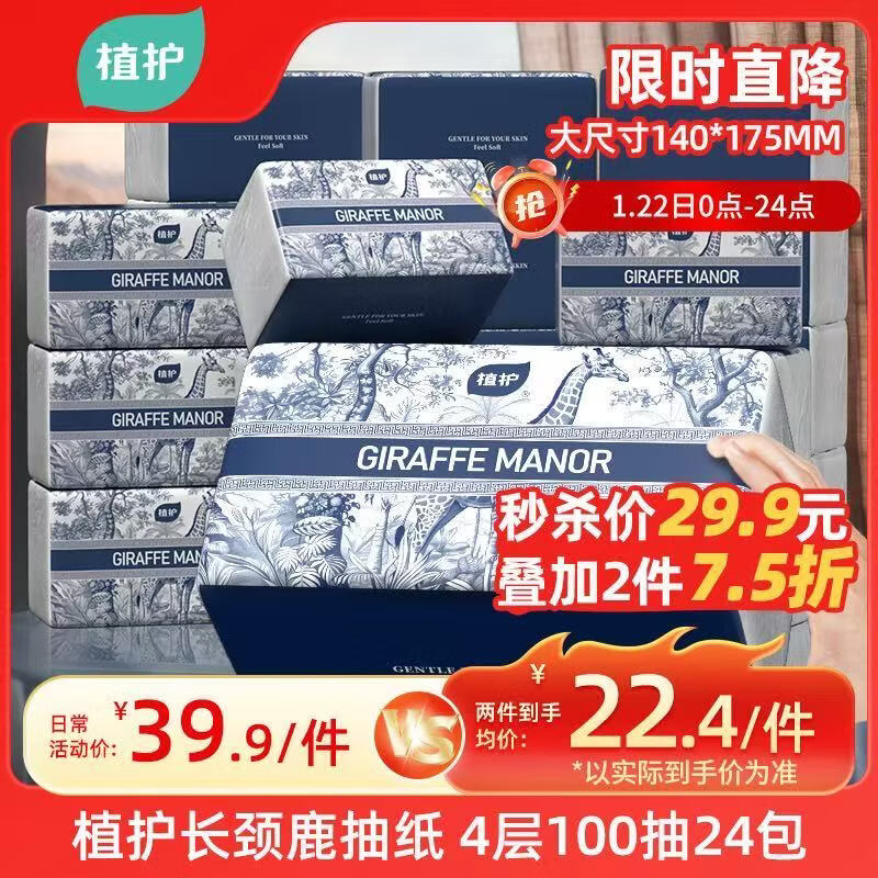 自营植护长颈鹿抽纸4层100抽*24大包整箱家用气垫纸巾婴儿餐巾面巾卫生纸