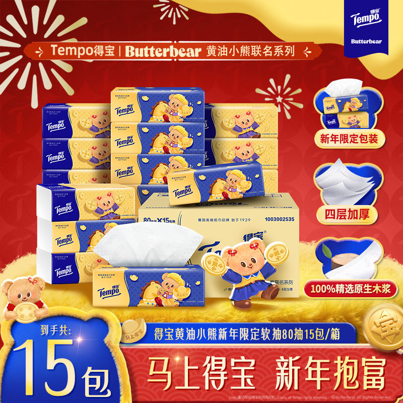 旗舰店得宝黄油小熊新年限定抽纸无香家庭必备4层加厚80抽纸巾DT