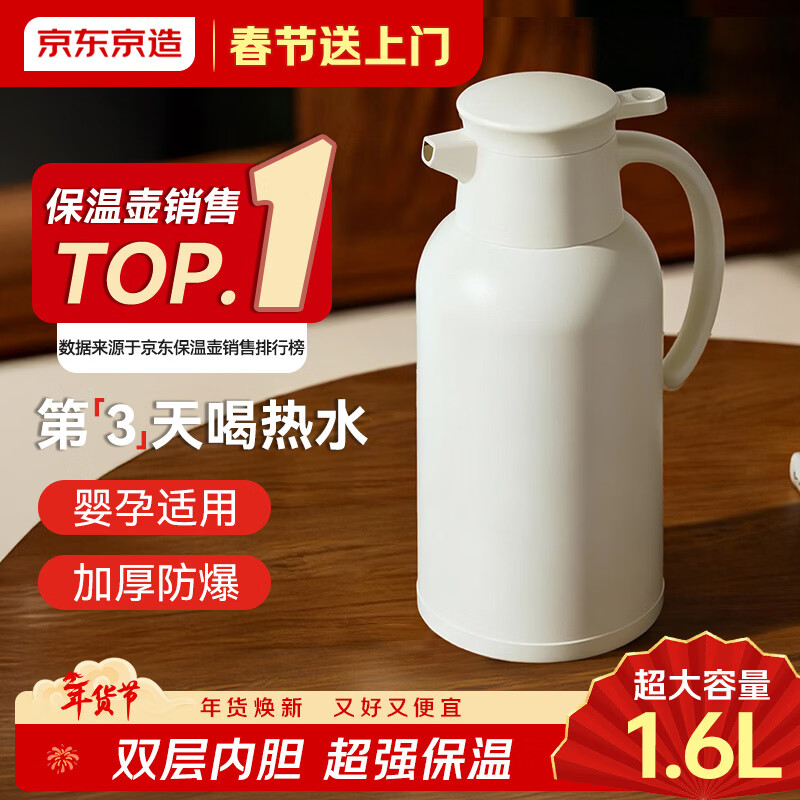 自营京东京造保温壶家用大容量热水瓶壶玻璃内胆双层暖水瓶壶宿舍办公1.6L