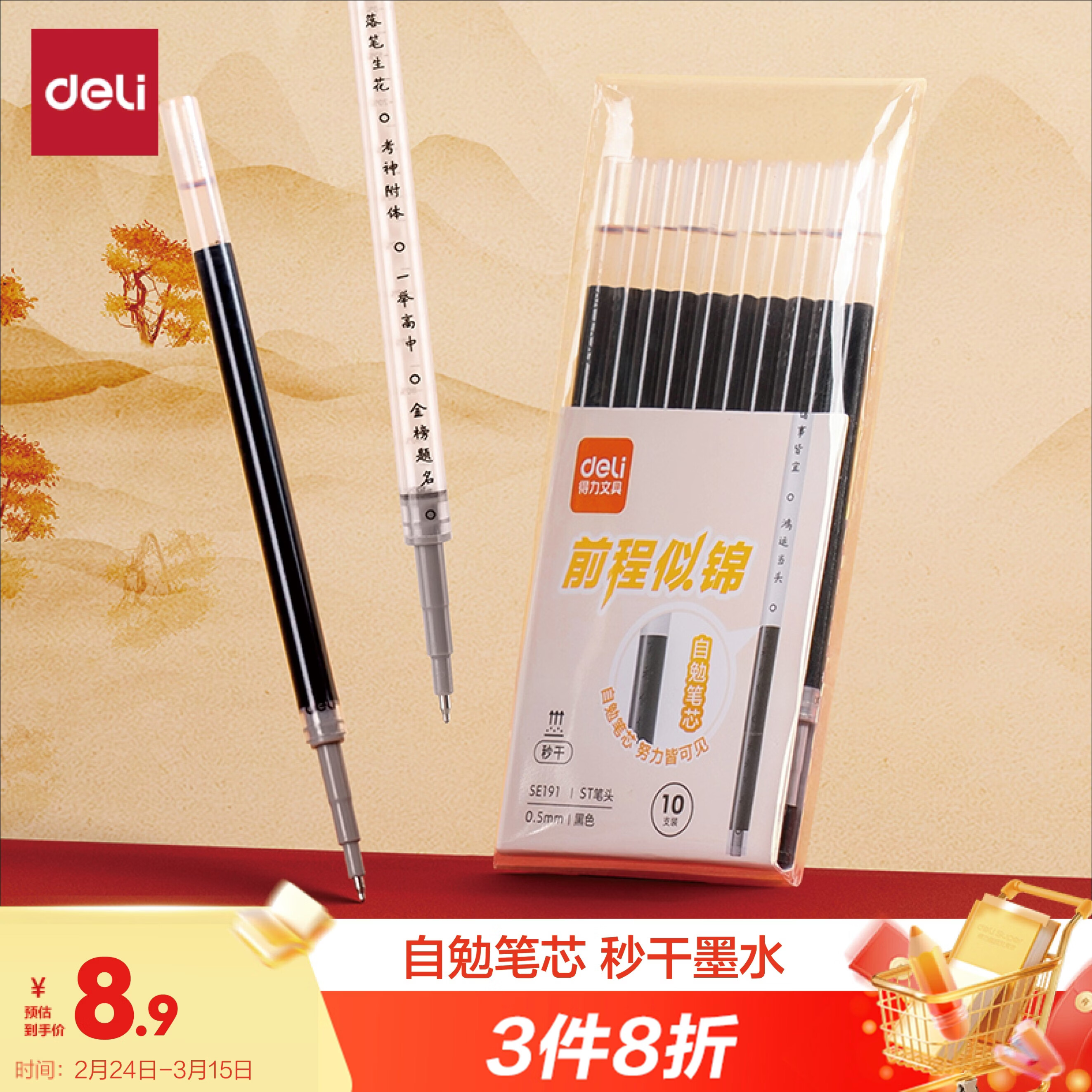 自营得力(deli)自勉刷题笔笔芯 秒干墨水学生中性笔替芯学生文具 0.5mmST头笔芯黑色10支/袋 SE191