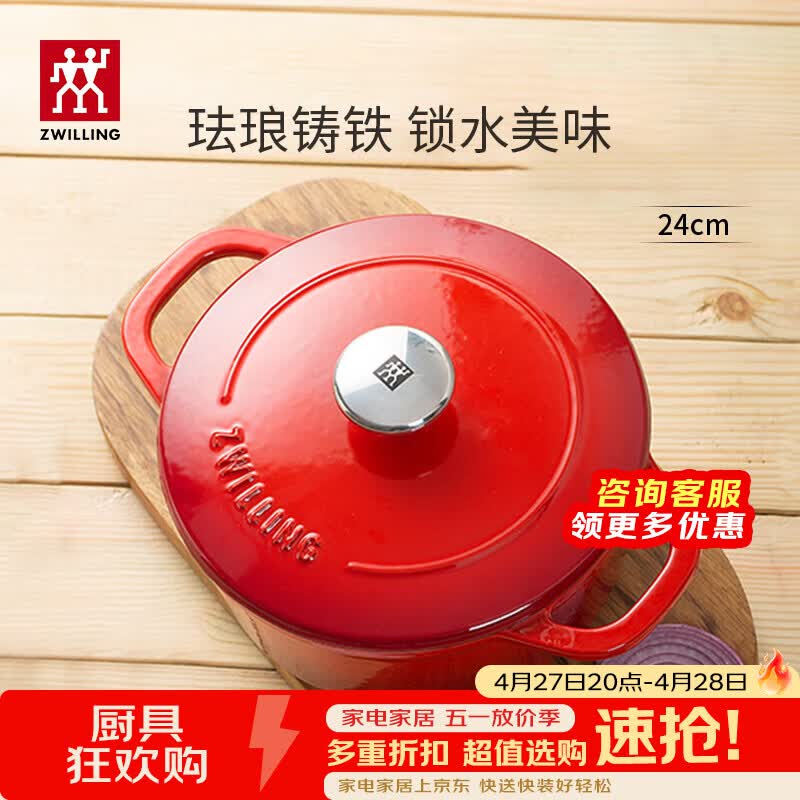 旗舰店双立人(ZWILLING)珐琅铸铁锅汤锅炖锅双耳煲汤锅平底锅烹饪锅具电磁炉燃气通用 亮红色 24cm