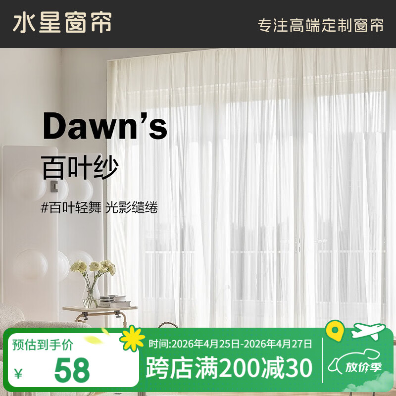 自营水星家纺纱帘透光不透人客厅阳台窗纱窗帘白纱挂钩款150宽×200高cm(单开)