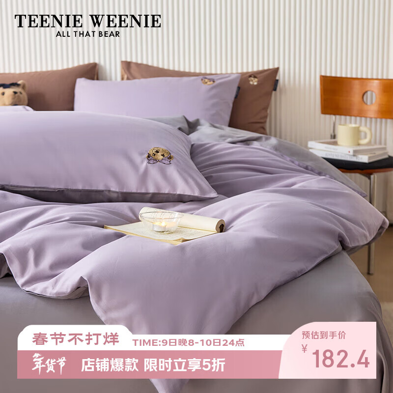 自营Teenie Weenie小熊床上四件套纯棉 A类100%全棉刺绣四件套双人床单被套1.5m床 海盐微风-香芋紫+中灰