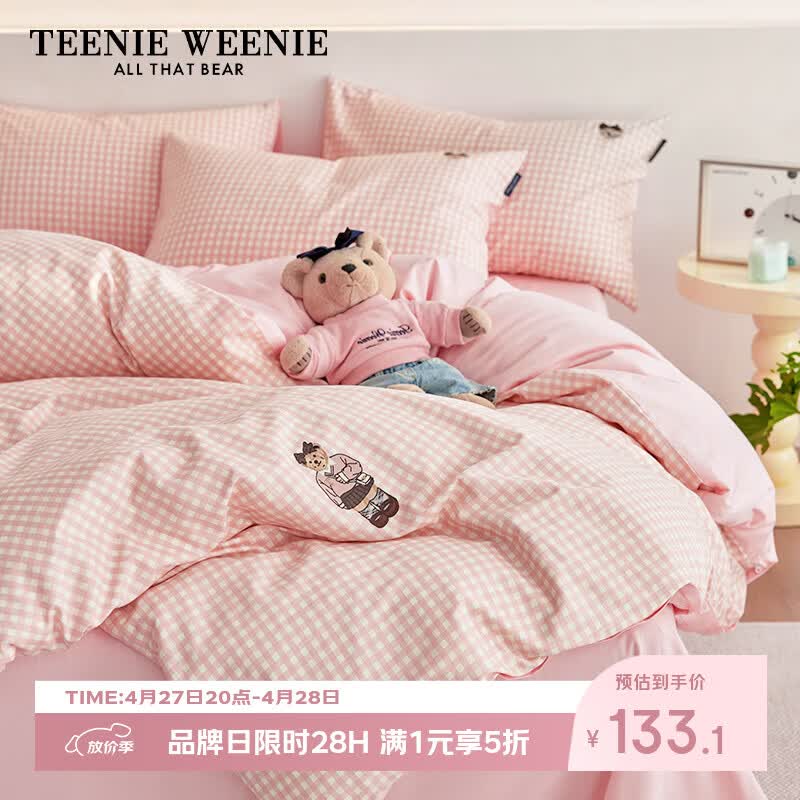 自营Teenie Weenie小熊A类纯棉三件套全棉学生宿舍单人床单被套罩床上用品1.2m床 茶语时光-粉格+柔粉
