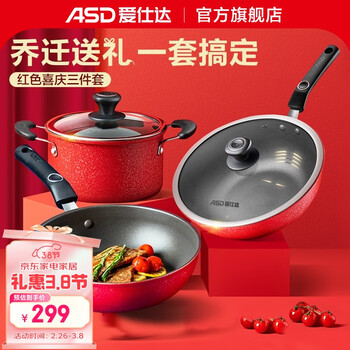 旗舰店爱仕达锅具套装不粘锅三件套 炒锅煎锅汤锅带木铲 家用少油烟不粘锅具 炒锅30cm+煎锅26cm+汤锅20cm 燃气灶电磁炉通用
