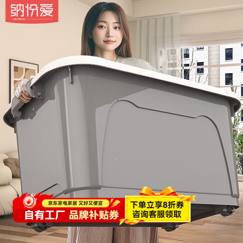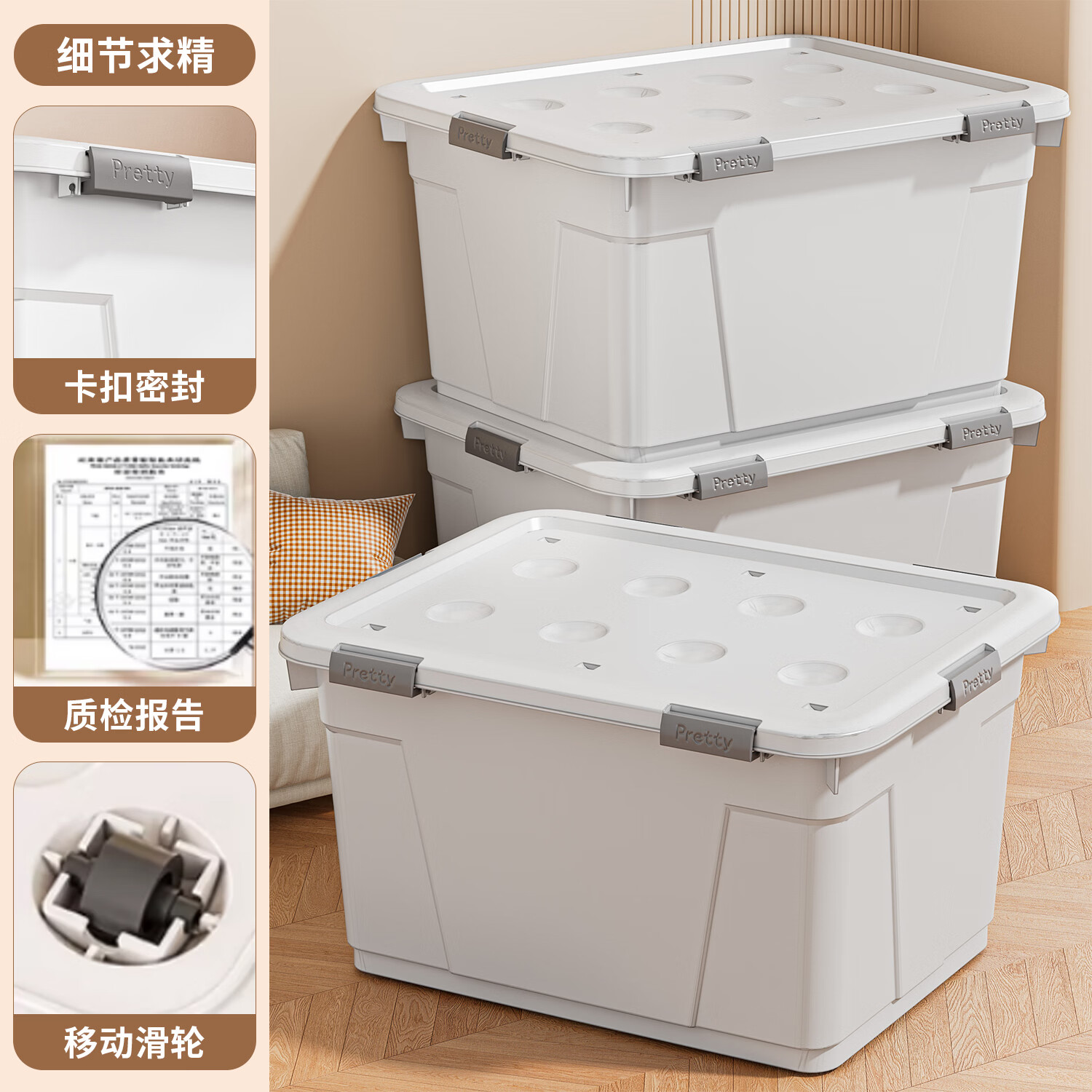 旗舰店纳份爱收纳箱塑料家用加厚加大容量超大号储物箱衣服被子玩具整理专用箱 白灰色-3个装 48#【51*36*28】4轮子+6卡扣+无手提