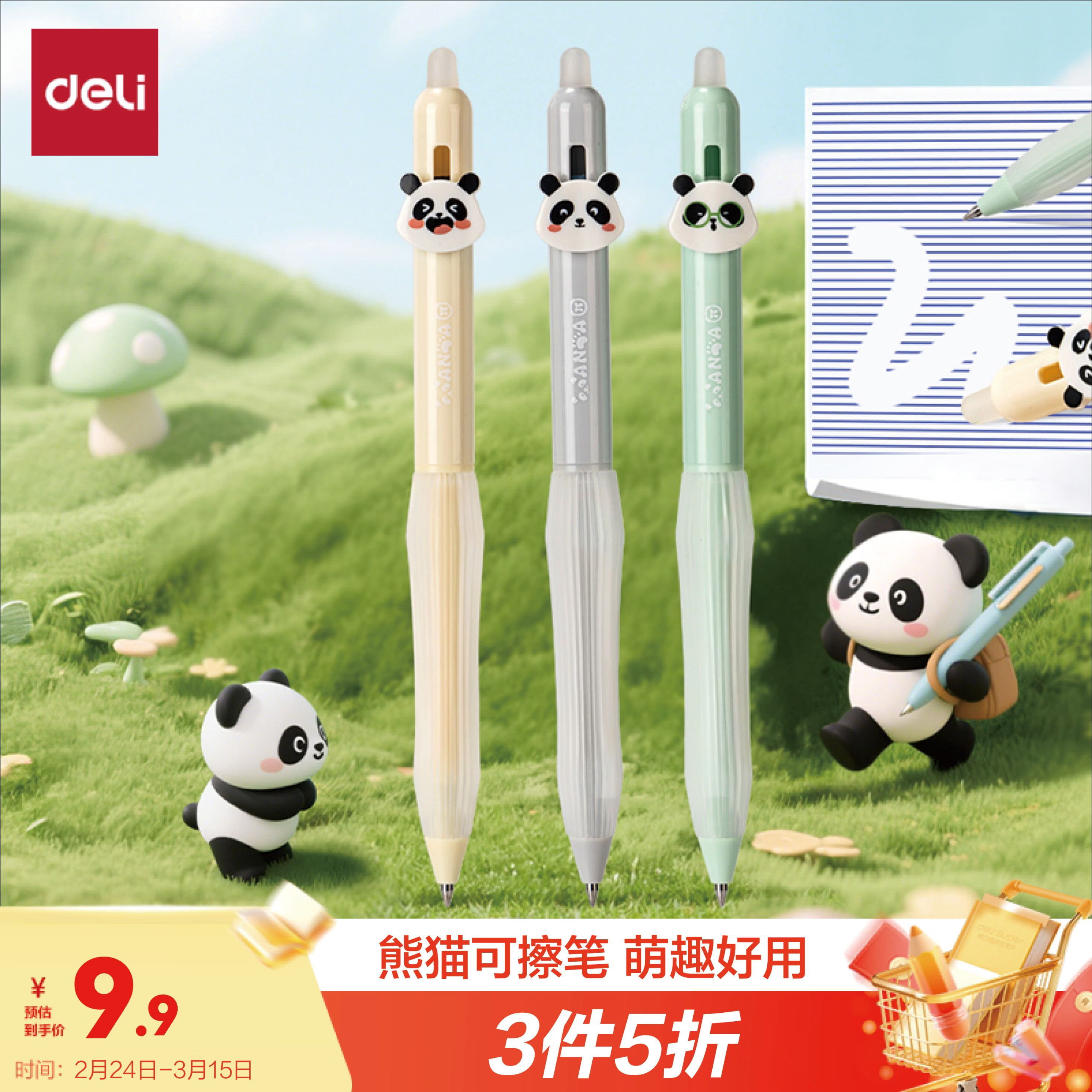 自营得力(deli)熊猫按动可擦中性笔 0.5mm子弹头学生中性笔热可擦笔 晶蓝3支/盒SA301