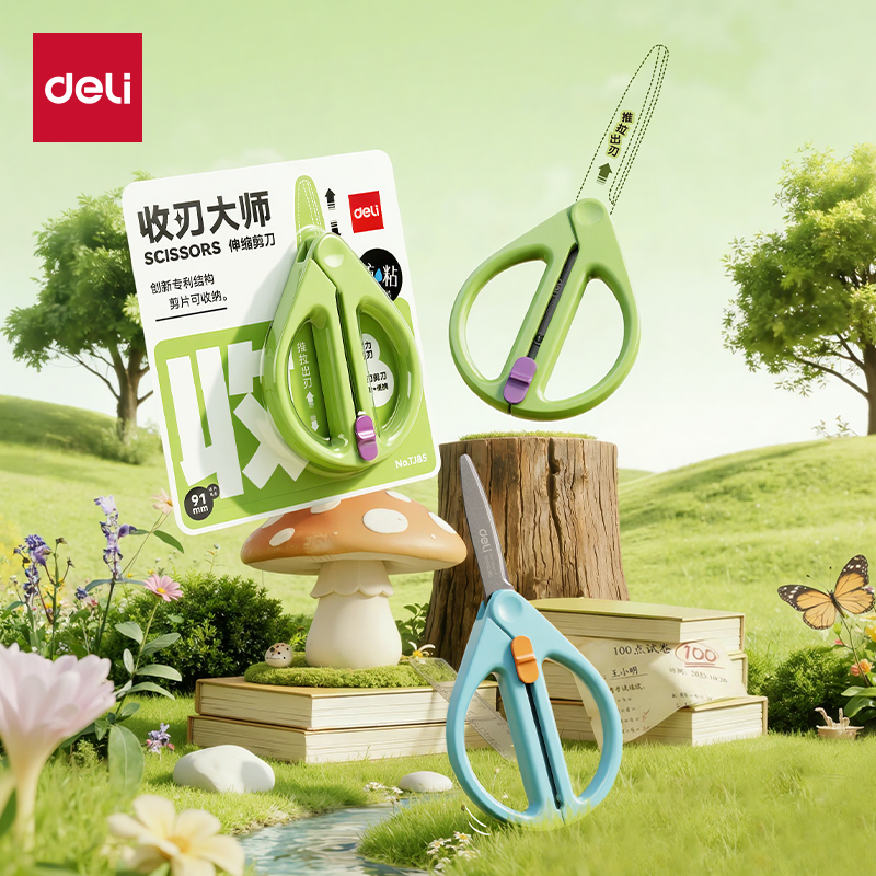 旗舰店【收刃大师】得力特氟龙剪刀儿童安全圆头幼儿园手工剪便携伸缩剪刀