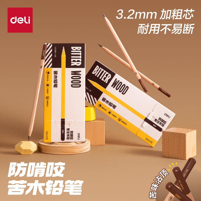 旗舰店得力苦味铅笔防啃咬小学生专用HB粗芯书写铅笔儿童六角杆练字铅笔