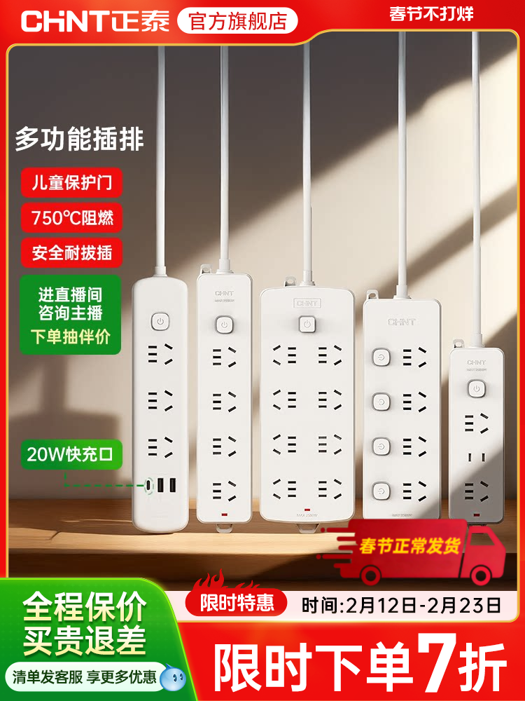 旗舰店正泰插座插排拖线板插线板带线面板多孔排插带usb快充家用插板
