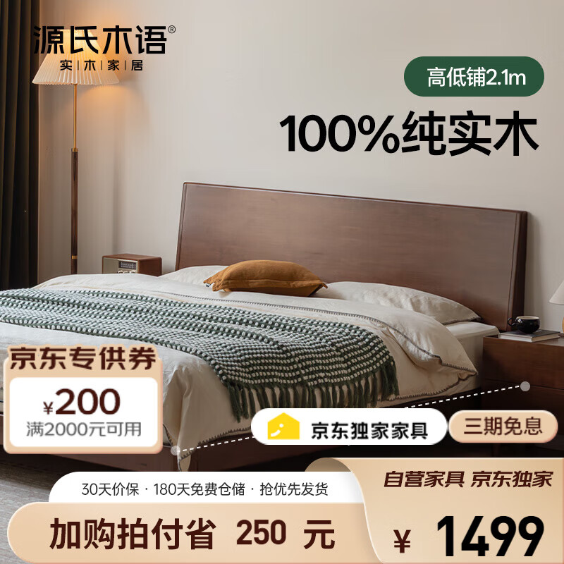 自营源氏木语实木床现代简约斜靠背双人床北欧小户型主卧大床胡桃色低铺1.8*2m