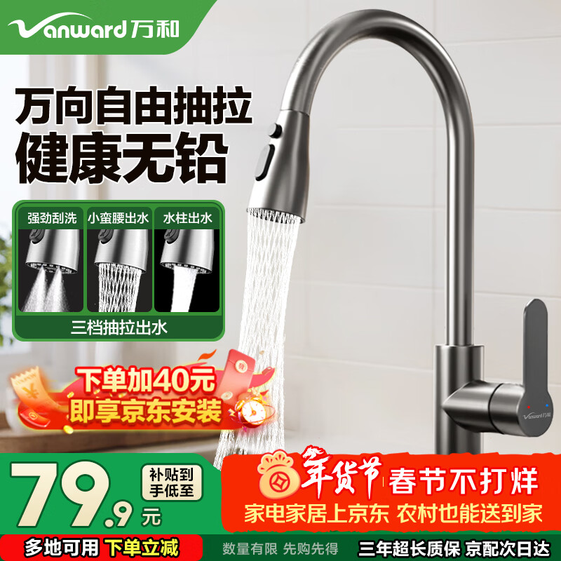 自营万和(Vanward)厨房水龙头洗菜盆三功能冷热抽拉式水龙头不锈钢洗碗池水槽龙头