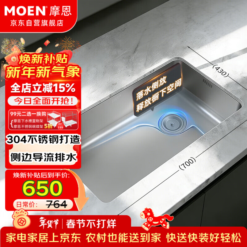 自营摩恩(MOEN) 304不锈钢厨房水槽洗菜盆洗碗槽拉丝防腐一体拉伸单槽SK42511C01