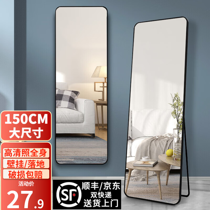 旗舰店初学者 穿衣镜 全身落地镜试衣镜家用防爆壁挂衣帽间铝合金网红大镜子 经典黑150*40【壁挂+落地】