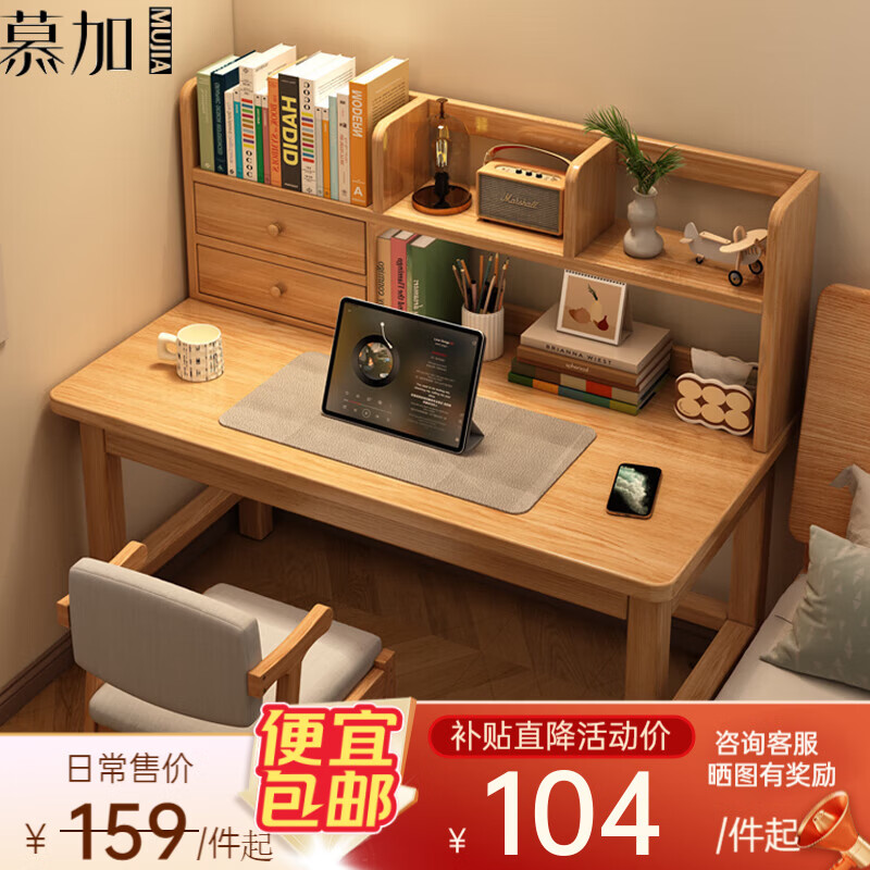 旗舰店慕加实木电脑桌书架一体简约风学习桌家用书桌卧室桌椅组合 【全实木清漆】原木色60*40cm