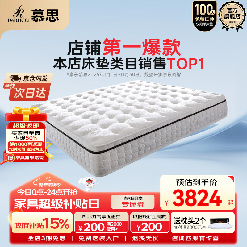 自营慕思(de RUCCI)天然乳胶卷包垫独立筒弹簧床垫子适中偏硬 小黑盒 1.8*2米