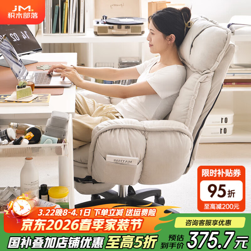 旗舰店积木部落 电脑椅子久坐舒适休闲电竞沙发椅人体工学家用学习椅可躺办公椅 米灰+脚踏【折叠扶手+可躺靠背】