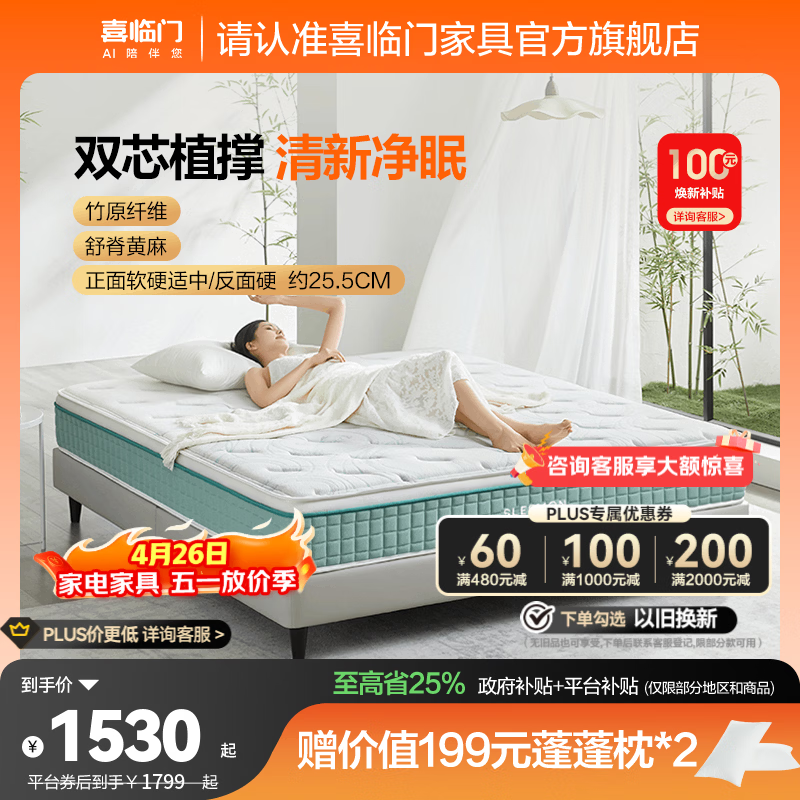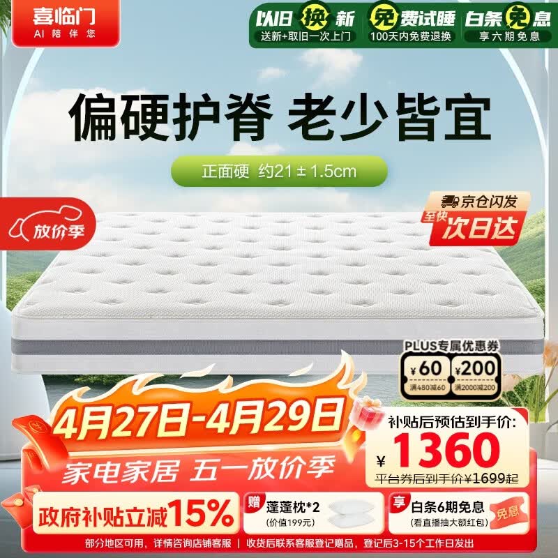 自营喜临门云朗pro床垫 泰国乳胶黄麻床垫独袋弹簧床垫 1.5x2米软硬适中