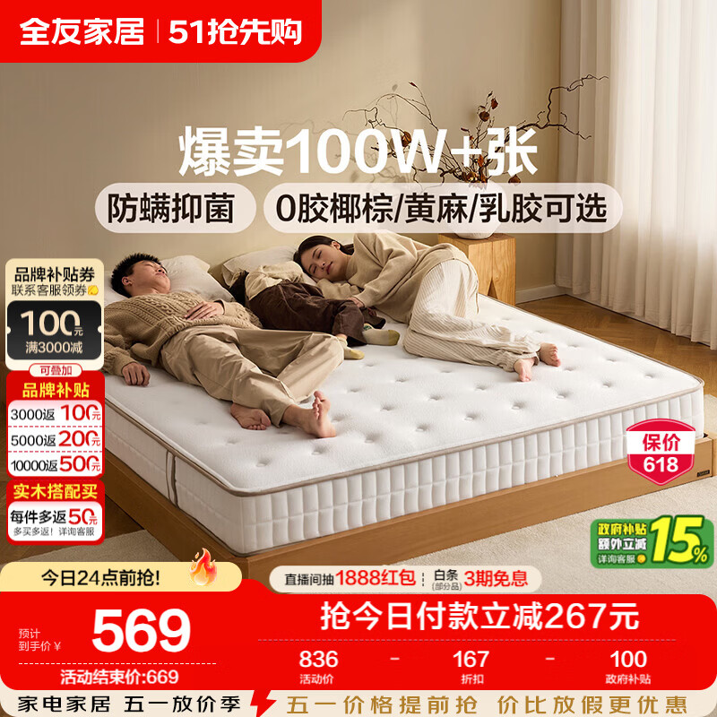 自营全友家居 天然椰棕床垫1.5x2米双人床垫护脊厚款偏硬席梦思弹簧床垫子