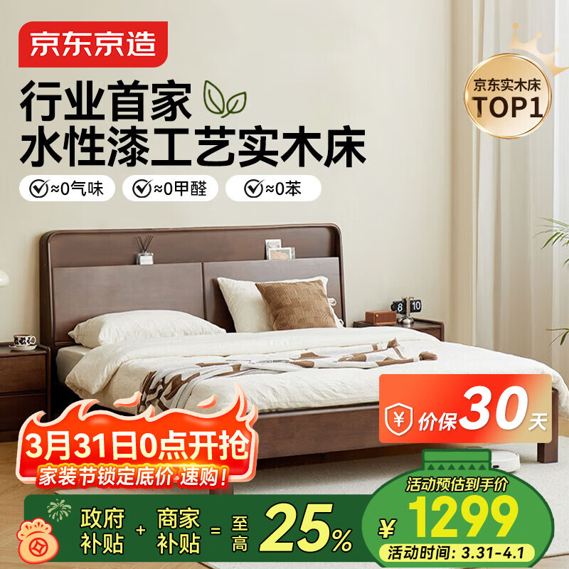 自营京东京造家居悦枫实木床 天然橡胶木 主卧双人床胡桃色1.8×2米