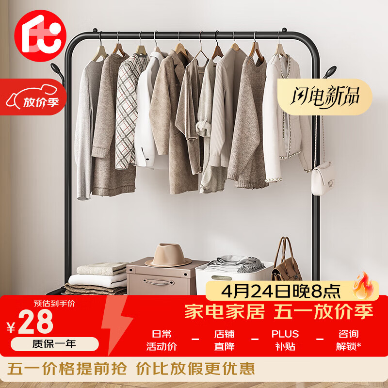 自营喻品衣架落地衣帽架挂衣架卧室客厅晾衣杆晒衣架可置物加粗MJ53黑100
