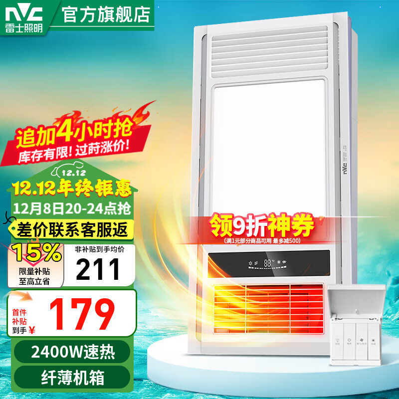 旗舰店雷士(NVC) 卫生间浴室浴霸风暖照明排气一体机高效换气大屏照明吊顶浴霸灯 【热销超薄款】2400W|四功能合一