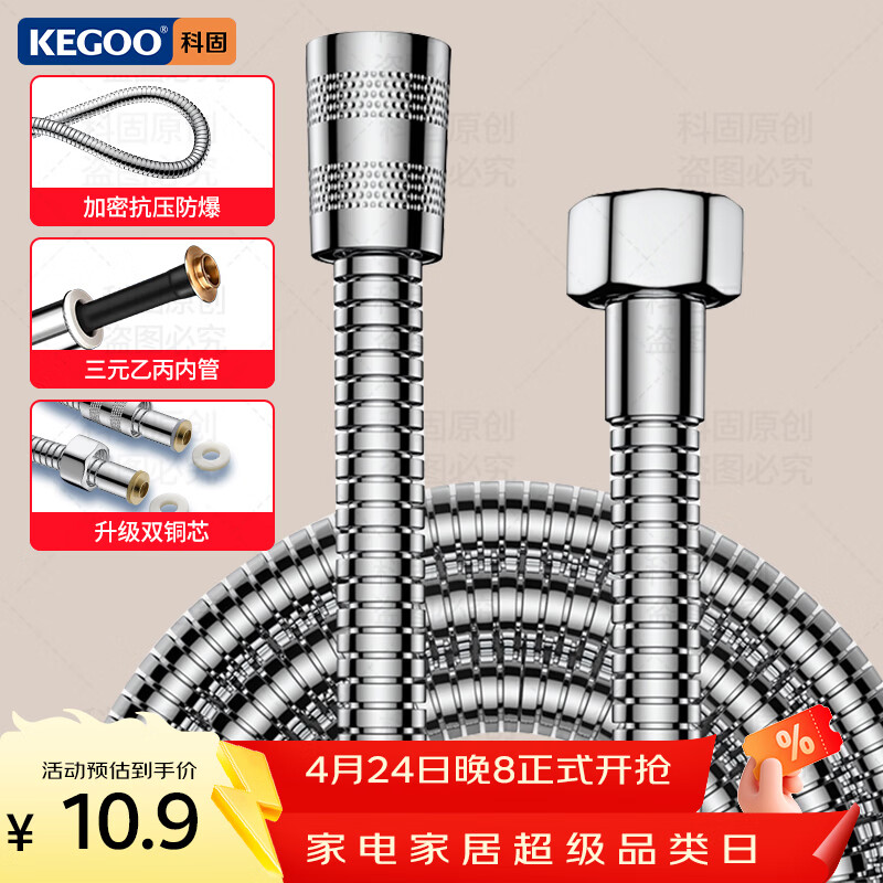 自营科固(KEGOO)K06044 花洒软管 1.5米不锈钢淋浴喷头莲蓬头防爆防缠绕水管