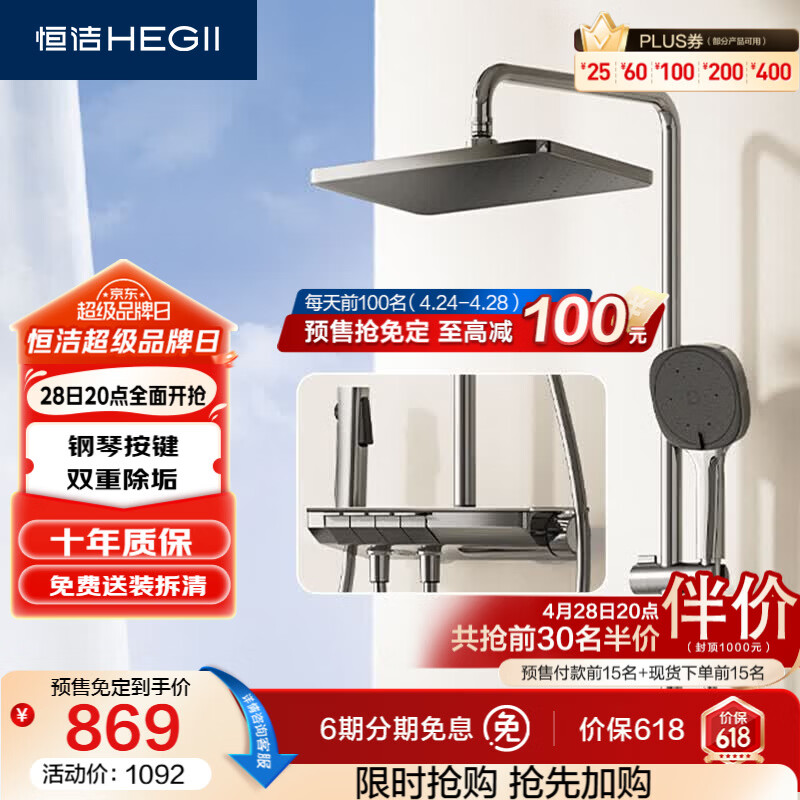 自营恒洁(HEGII)花洒淋浴套装Y55 琴键置物除垢自洁卫生间花洒套装HMF938-333-SH