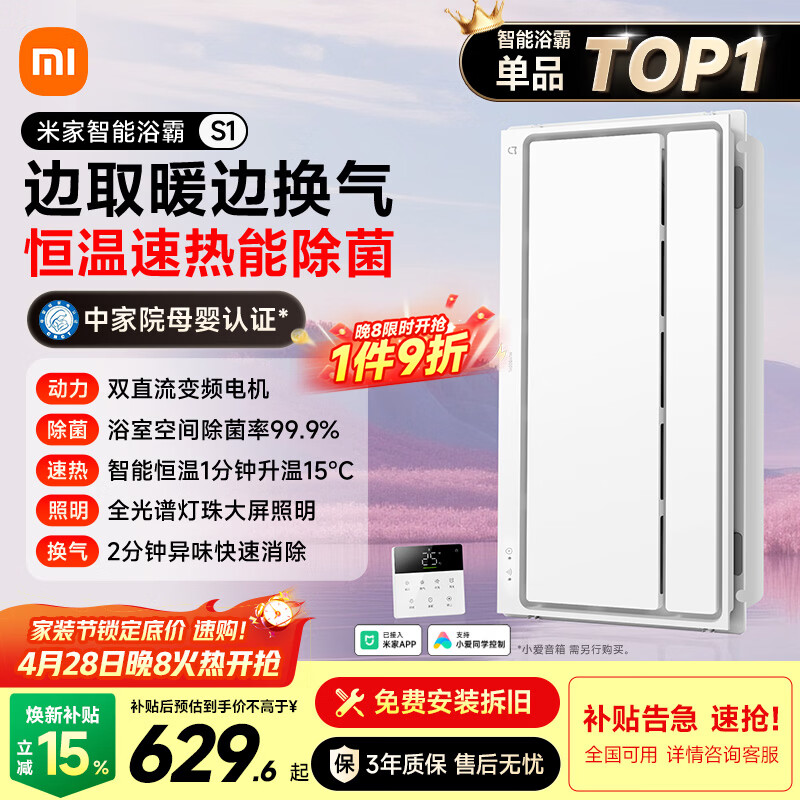 自营米家智能浴霸双核暖风控温恒温等离子除菌速热照明排气全光谱LED S1