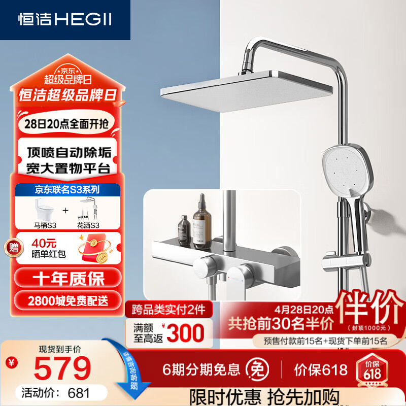 自营恒洁(HEGII)花洒淋浴套装S3 除垢自洁置物卫生间洗澡花洒套装HMF936-333