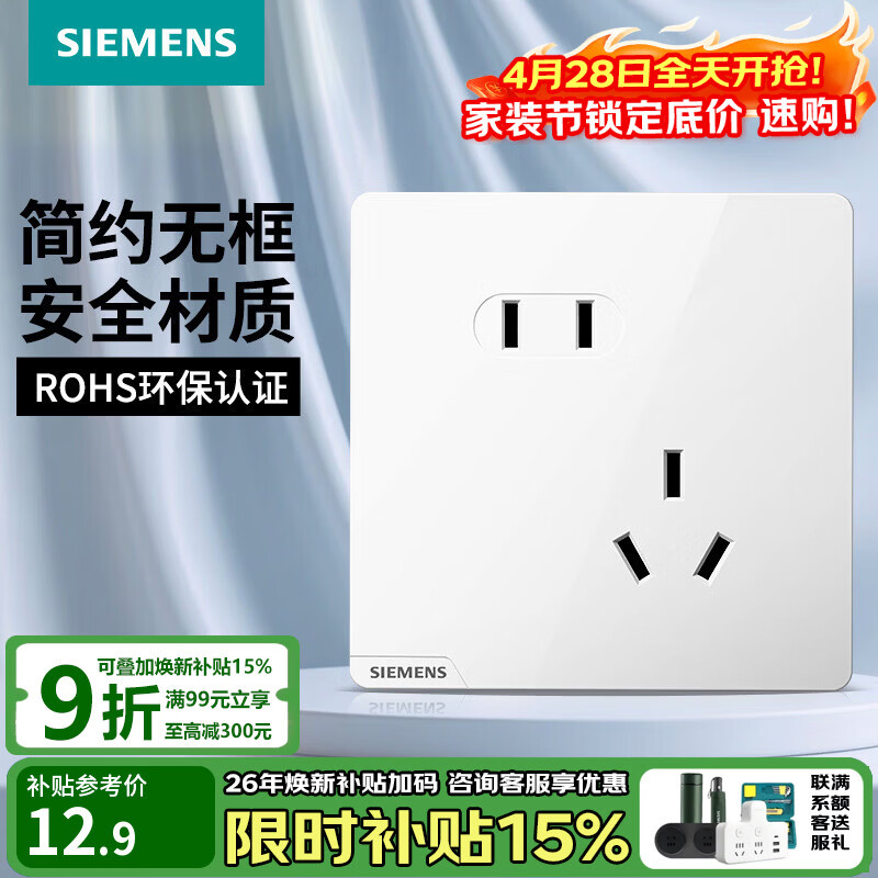 旗舰店西门子(SIEMENS) 开关插座面板 五孔电源墙壁插座 皓彩系列白色 斜五孔 二三插 插座