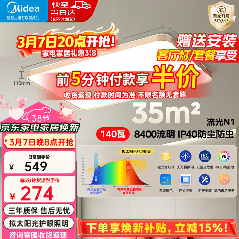 旗舰店美的(Midea)【新品】led吸顶灯客厅灯wifi智控调光卧室全屋灯饰套餐灯具大全 三段调色|140W客厅灯|三防