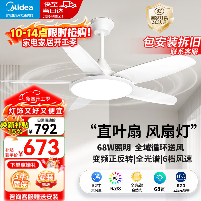 旗舰店美的(Midea)LED吊扇灯开叶扇变频电机遥控餐厅卧室全光谱风扇灯一体 52寸68瓦/全光谱/无极调光调色