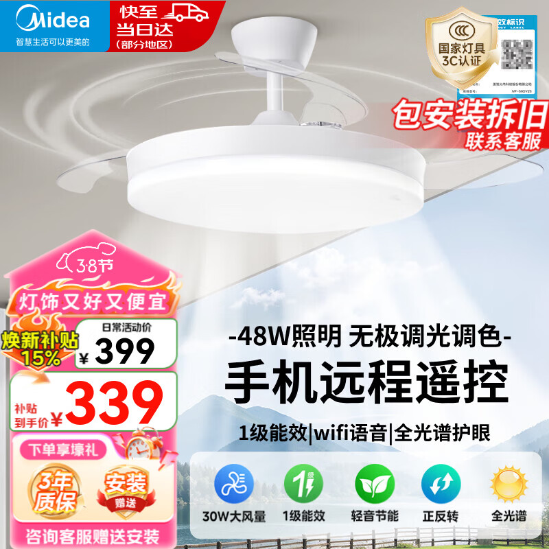 旗舰店美的(Midea)风扇灯一体餐厅吊扇灯led客厅卧室隐形扇叶护眼遥控灯饰灯具 WiFi智控|42寸78瓦无极调光 风扇灯