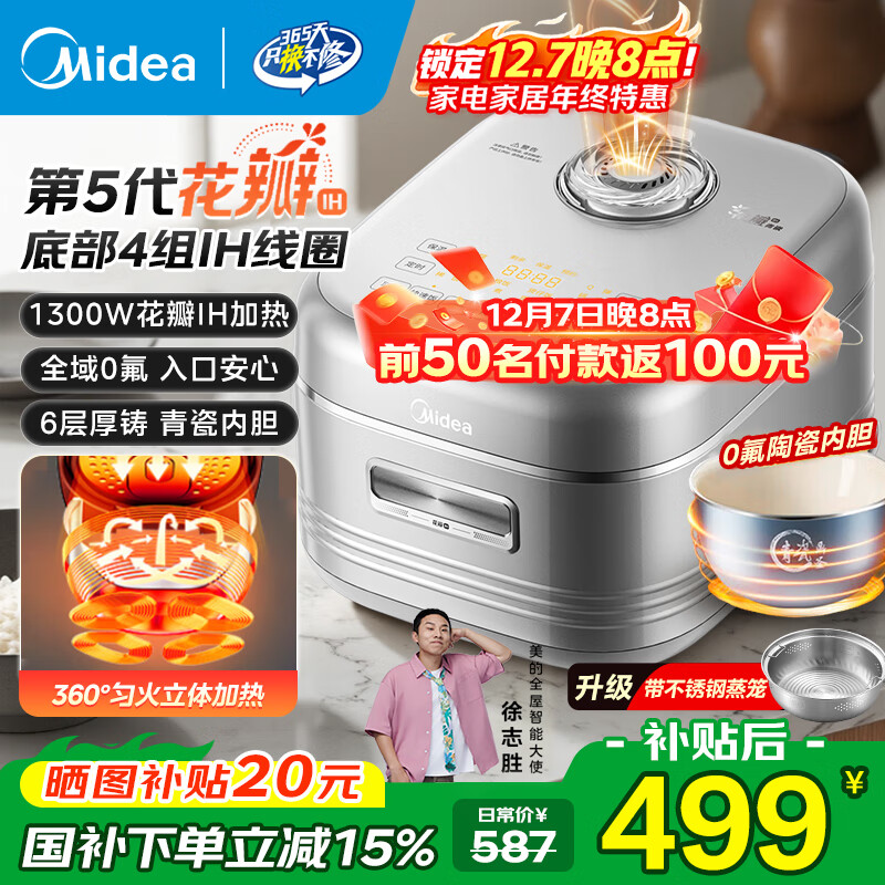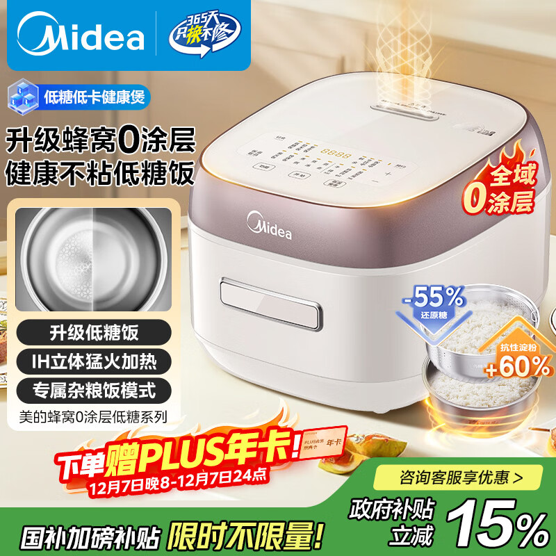 自营美的(Midea)低糖电饭煲电饭锅0涂层3升2-3人无涂层316L不锈钢内胆一键柴火饭家用多功能MB-3E91LS