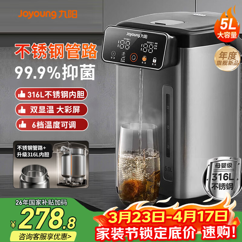 百亿补贴九阳(Joyoung)恒温电热水壶一体机 5L电热水瓶烧水壶316L家用智能饮水机自动断电保温一体不锈钢管路恒温壶WP571 5L 【316L母婴级】双显 金属管路