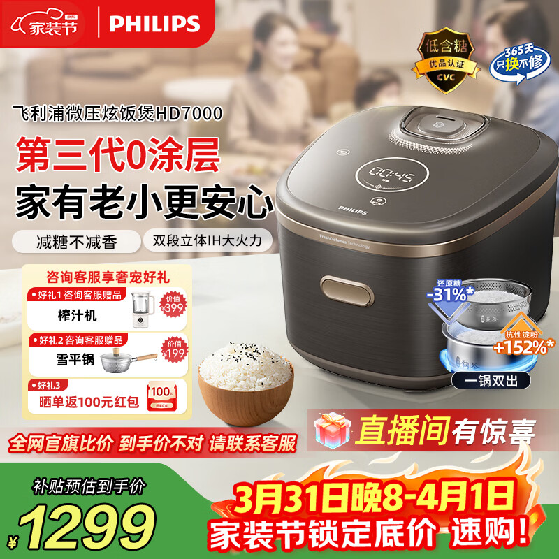 自营飞利浦(PHILIPS)低糖炫饭煲316L内胆 0涂层IH加热 4L家用电饭锅不粘锅 微压电饭煲4-5人HD7000 送礼礼物
