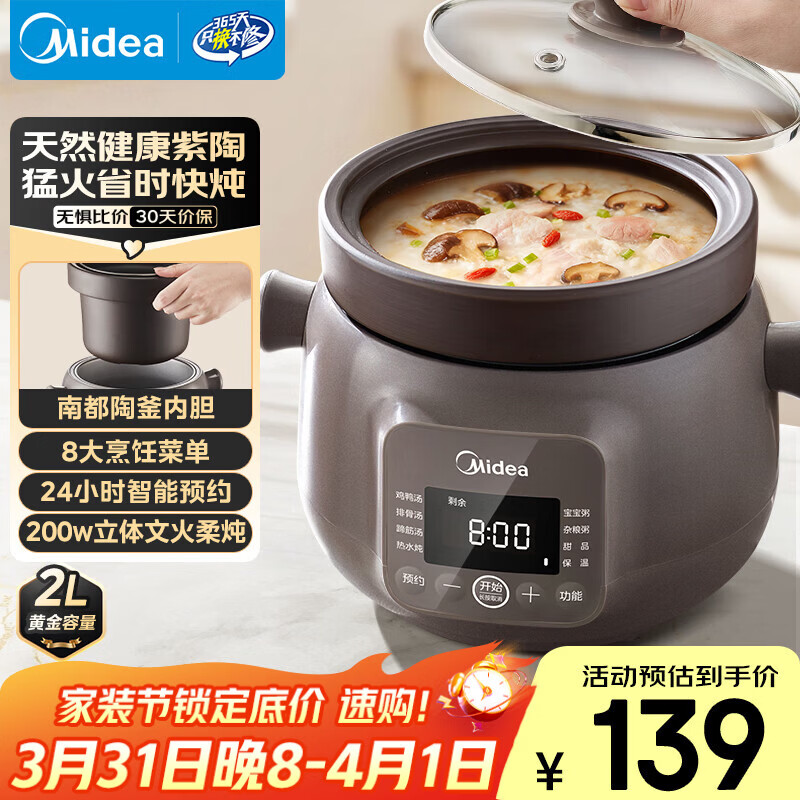 自营美的(Midea)电炖锅电炖盅电砂锅 陶瓷煲汤锅紫陶炖汤锅 燕窝炖盅煮粥锅电煮锅宝宝辅食锅2L快炖MD-DGE2056