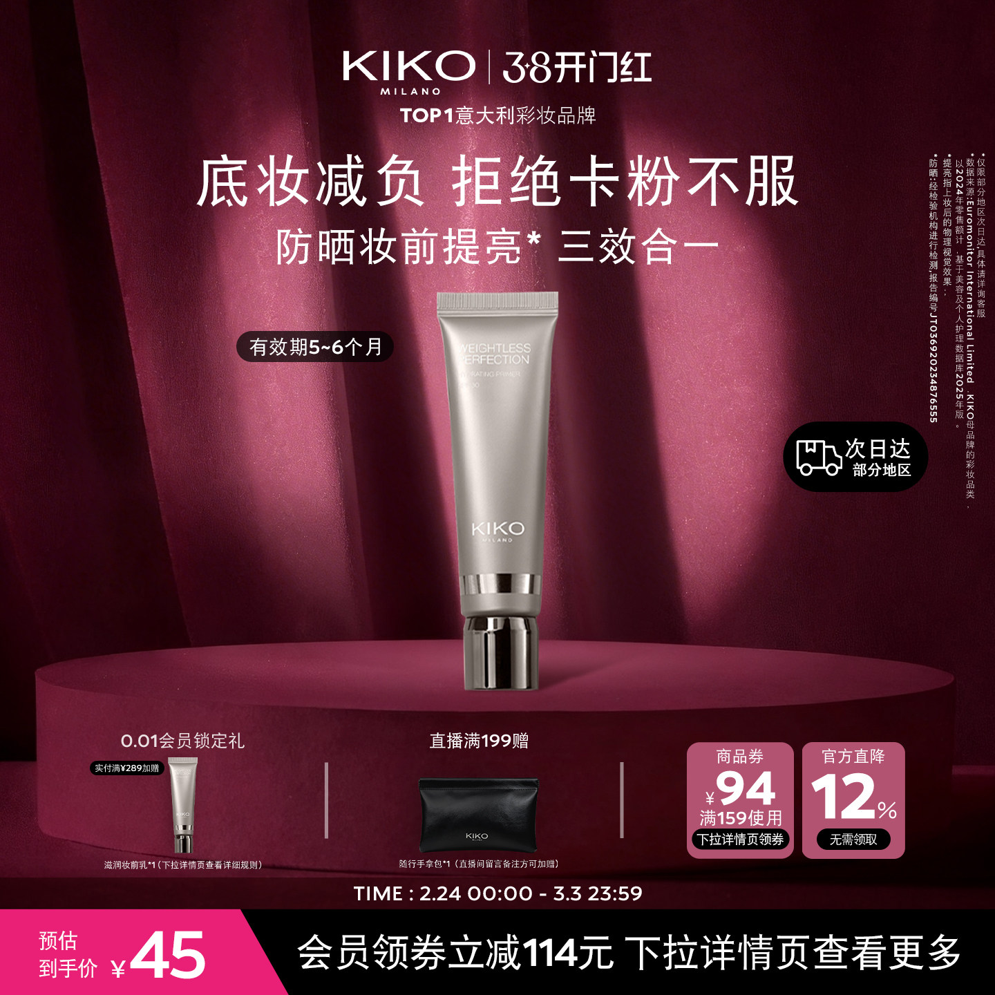 旗舰店意大利KIKO妆前乳隔离素颜霜高防晒提亮肤色 有效期5~6个月