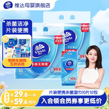 旗舰店维达(Vinda)【赵丽颖同款】杀菌湿巾单片独立装 零酒精婴儿卫生湿纸便携出行 10抽 10包 两提共100片