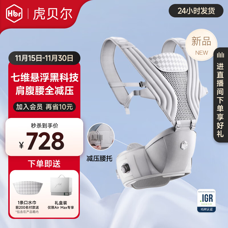 旗舰店虎贝尔(HBR)AirMax悬浮腰凳婴儿背带宝宝轻便四季多功能抱娃神器减压 【七维减压】腰凳-银雾白(礼盒装)