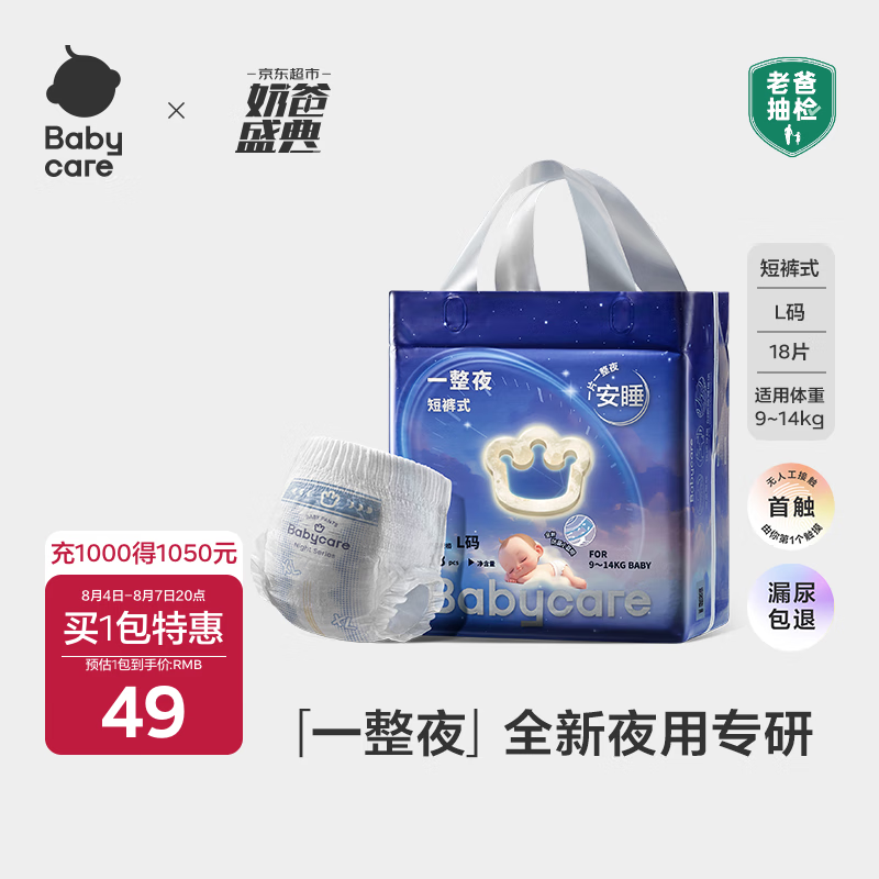 旗舰店babycare一整夜拉拉裤宝宝婴儿新生儿夜用大吸量透气bbc尿布夏日 L 18片 迷你装【体重9-14KG】