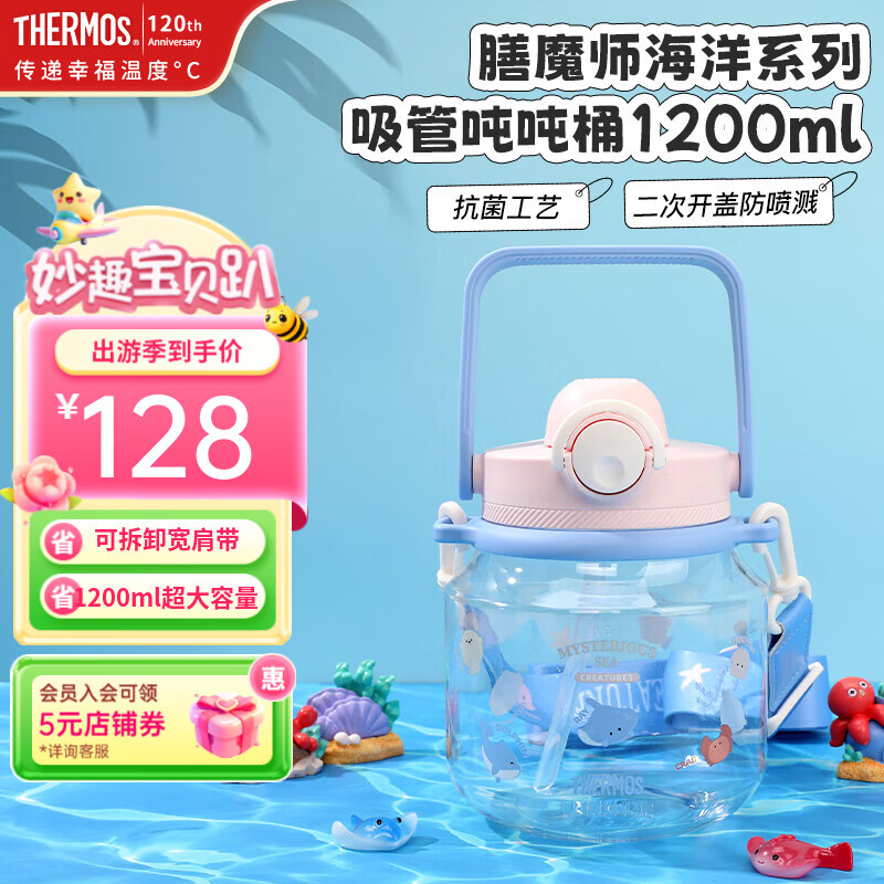 旗舰店膳魔师吨吨桶大容量大肚杯儿童水杯大肚吸管杯直饮杯户外喝水杯子冷水壶 海洋系列1200ml粉色