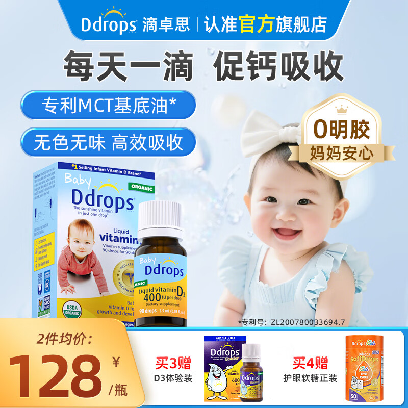 旗舰店Ddrops滴卓思 婴幼儿童维生素D3滴剂 新生儿童宝宝DD小滴瓶vd3非乳钙ad 【出生-1岁】婴儿D3滴剂400IU