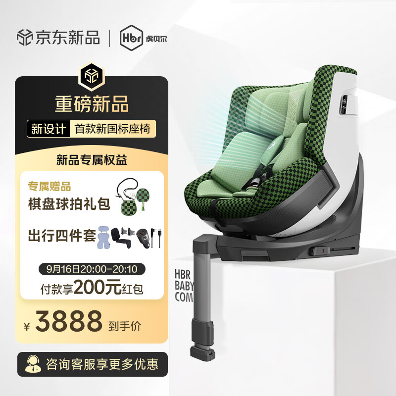 自营虎贝尔(HBR)E360pro新国标儿童安全座椅汽车用0-12岁i-Size棋盘格绿智能循风