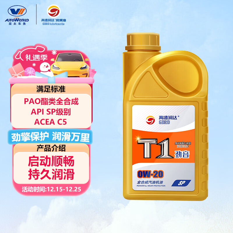 自营高德润达【劲音T1系列】PAO酯类全合成机油 SP/GF-6 C5 0W-20 1L 汽车保养